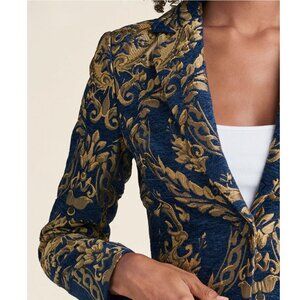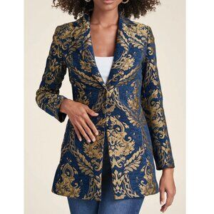 Turn heads in this stunning VENUS brocade blazer jacket. Features a bold royal blue and metallic gold baroque floral pattern, single-button closure, longline tailored cut, and fully lined interior. Perfect as a statement piece for parties, holidays, or dressed-up casual looks.