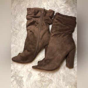 Elegant brown suede booties with a stylish peep-toe design. Perfect for versatile wear.