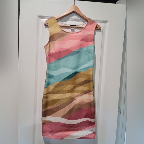 Chic sleeveless mini dress with a wave pattern. Features pink, blue, and gold hues. Perfect for a stylish look.