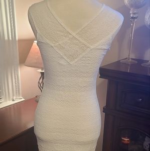 This dress is perfect for Summer!! The lace is very pretty and it is fully lined. Never been worn. Sits right below the knee.