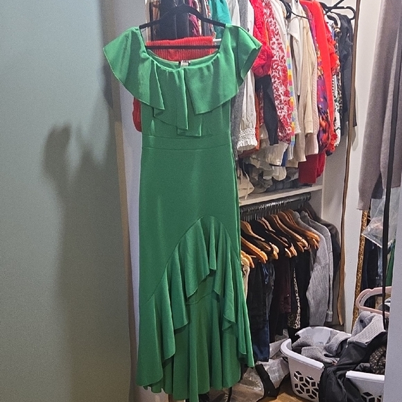 VENUS dress in vibrant green. Off-shoulder ruffle neckline. Fitted waist with cascading high-low ruffle skirt. Elegant, flowy silhouette for events.