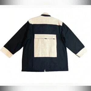 Venus Imports vintage 90’s Cotton Jacket Black and Tan Rustic Streetwear unisex style. Huge oversized front pockets and supersized pocket with Velcro closure. Wood button front closure.