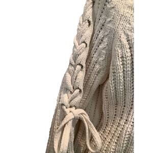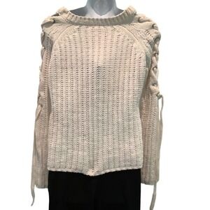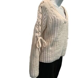 VENUS super soft ivory chenille knit long sleeve sweater. Size S. In excellent condition. Substantial weight cozy warm sweater. V-Neck. Sleeves have silver tone grommets and ties that lace up the sleeve. Ties can be adjusted to as tight or as loose as you prefer. Leave them looser to show a little skin, or pull them tight to keep out the cold. The ties are made of the same sweater material. A nice addition to your fall/winter wardrobe.