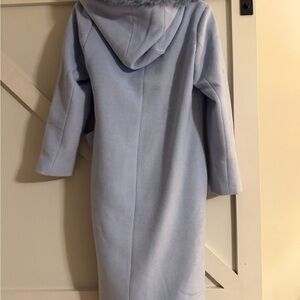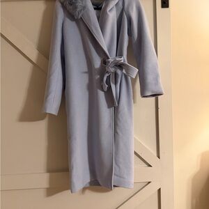 Elegant light blue coat with a stylish belt and a furry hood. Size large. Worn 1 time