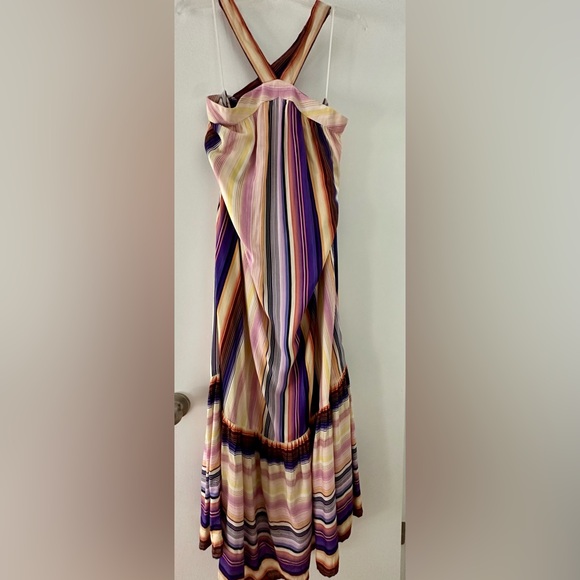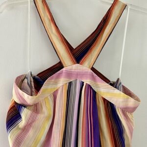 Vibrant maxi dress with multicolor stripes. Features a flowing design and crisscross straps.