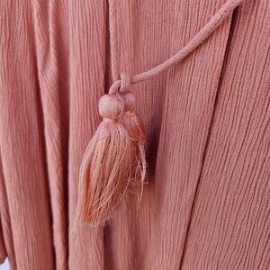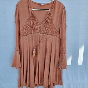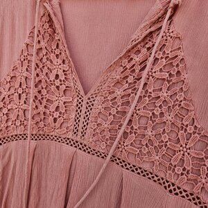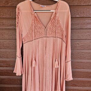Chic mini dress with lace details. Soft pink hue. Flared sleeves and tassel ties.