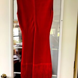 Bold red dress with fringe hem. Sleeveless design. V-neckline. Gorgeous. Never worn. This dress will turn heads. Very nice fabric. Perfect for a night out. Pit to pit measures 16 with stretchy material. This is a must have for your special occasion.