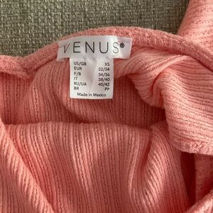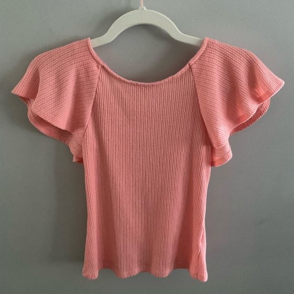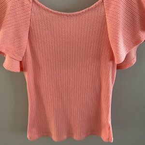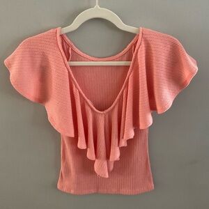 This chic like Coral color blouse from VENUS showcases a ribbed texture and ruffled short sleeves, offering a stylish and summery vibe. The lightweight fabric and cropped design make it a perfect match for high-waisted bottoms, adding a modern flair to your wardrobe. Beautiful V-neck ruffled back.
