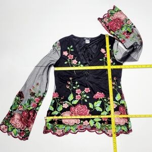 VENUS Rose Embroidered Tie Front Sheer Bell Sleeve Scallop Edge Blouse (XS)