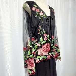 Highlights: intricate rose embroidered detail, scalloped embroidered edging, sheer bell sleeves, tie front closure, v-neckline and fully lined.