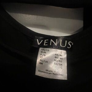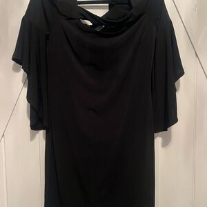 Chic black sdress by VENUS. Features elegant ruffle accents on arms and cutout under neck. Perfect for evening wear.