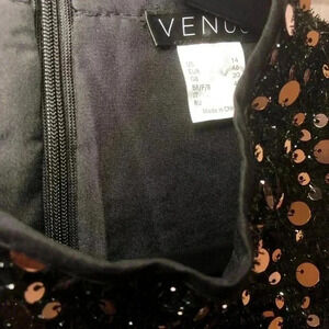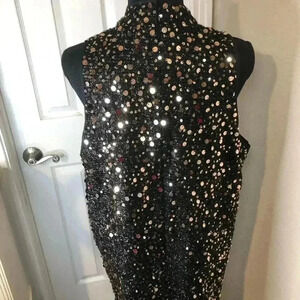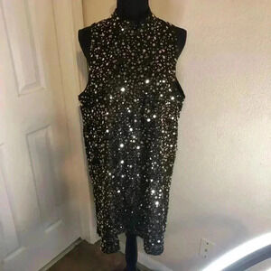 A mini dress with maximum glam factor. Embellished with allover paillettes on top of metallic eyelash fabric, this sleeveless mini dress delivers all the sparkle you need for party season. The mock neck and A-line silhouette have a retro vibe so you’ll feel like a disco ball shining at the center of it all.