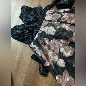This strapless party dress by VENUS is gorgeous—a sweetheart velvet bodice with a nice stretch and gorgeous velvet tie/bow…high low with a champagne rose gold floral scheme and tulle overlay.