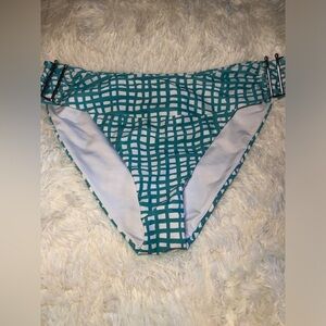 Stylish bikini with a teal and white geometric pattern. Perfect for beach days.