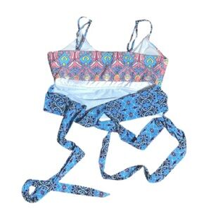 Make a splash in this bold and flattering VENUS wrap-style swim top! Designed for both comfort and coverage, this swimsuit top features an eye-catching pink, coral, and blue baroque-inspired print. The wide wraparound sash ties at the waist, creating a customizable fit with a stylish edge. Adjustable shoulder straps and supportive stretch fabric make this top perfect for pool days or tropical getaways.