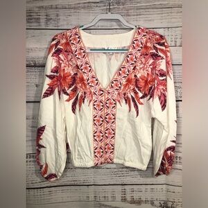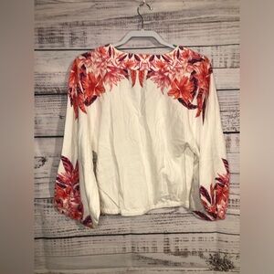 This top features a beautiful cream color adorned with vibrant red pink floral patterns that create a striking visual appeal. The relaxed fit and embellished design make it perfect for casual outings or special occasions.