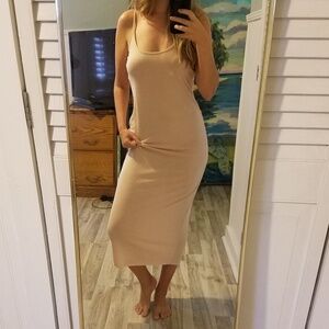 Mid length, adjustable spaghetti straps, raw cut hem at calf. A sexy and simple dress. Slightly see through