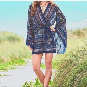 VENUS navy blue, brown & gold boho Bohemian deep v-neck romper L