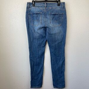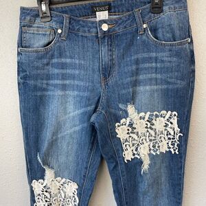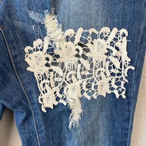 Super cute pair of jeans featuring a distressed design and white lace patches. They measure 16.5 inches at the waist laying flat and with a 41 inch inseam.