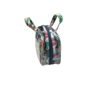 Features: Clear exterior for easy content visibility, Top zipper closure, Dual top handles for portability, Colorful postage stamp-inspired print interior lining