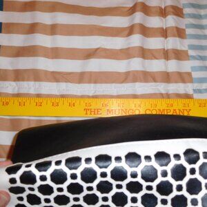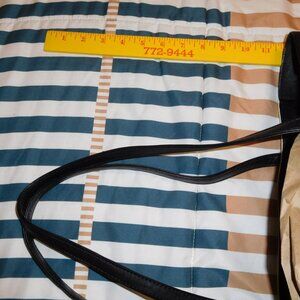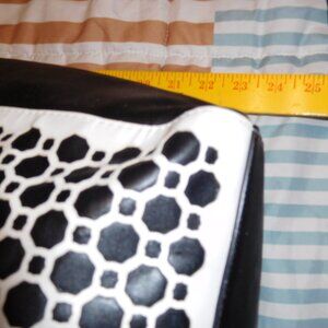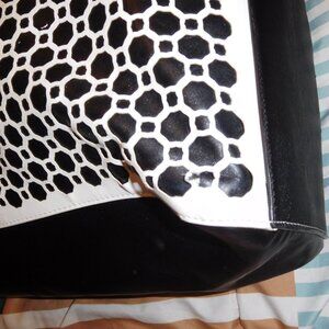 PRE-LOVED BY ME, VERA BRADLEY LASER-CUT TOTE, MIDNIGHT GEOMETRIC IN BLACK/WHIATE. IT IS FAUX LEATHER AND IT IS A WEE BIT FRAGILE. THERE IS SOME WEAR ON THE LOWER LEFT CORNER AS SEEN WHERE SOME OF THE WHITE CUT IS OFF, THE BLACK IS STILL BEHIND IT BUT THE WHITE LASER CUT IS FREGILE IN THE CORNERS, IT'S JUST HOW THIS STYLE IS. TEH BAG IS STILL VERY USABLE. THE DOULBE HANDLES ARE PUCKERING A LITTLE BIT, AGAIN NO DAMAGE BUT I NEED TO TELL YOU ABOUT THAT AGAIN IT IS DUE TO THE MATERIAL. VERY NICE BAG FROR TRAVEL, WHICH IS HOW I USED IT, FOR IN AND OUT OF HOTELS OVERNIGHT. IF IT DOES NOT SELL IN THIS ONE 30 DAY PASS THEN i IWLL PUT IT BACK IN THE CAR FOR THOSE OVERNIGHTS.