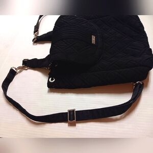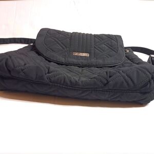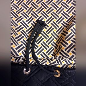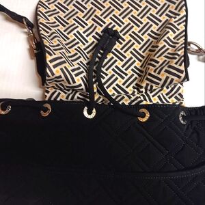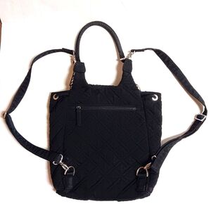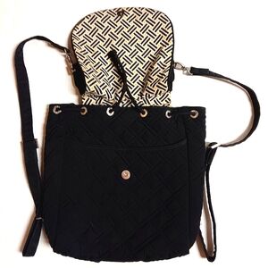 VERA BRADLEY π Backpack is apx 12" x 14" in size. NWOT. NO issues. *Rare* Black with bright and gorgeous geometric pattern within in yellow/navy/white. Features the signature logo in Silver on front center, with Silver fixtures/clasps. There is plenty of storage (without looking bulky!)- 2 front pockets, two side pockets and one zip closure pocket inside, one large pocket on the back also with zipper closure. This is the perfect bag for anything! Sleek & Classy with plenty of storage!