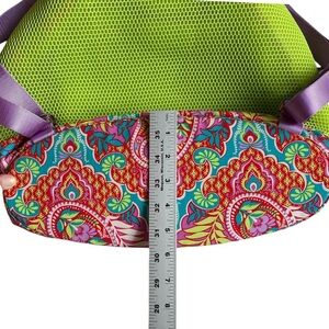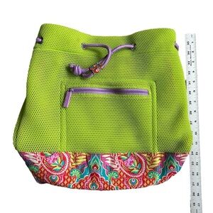 Unveil your vibrant side with the VERA BRADLEY Citrine Paisley in Paradise Mesh Drawstring Backpack. Crafted from a blend of polyester, nylon, and mesh, this backpack is a testament to durability and style, featuring a lively paisley & floral pattern that captures the essence of spring and summer. The green & multicolored exterior is complemented by purple straps, adding a pop of color to your everyday outings. Designed for versatility, the backpack boasts a lined interior, adjustable straps, and convenient outer pocket to keep your essentials organized. Whether you're off to the beach, attending a casual party, or simply enjoying a tropical getaway in your imagination, this backpack, equipped with grommet accents and the Vera Bradley logo, offers a mix of functionality and fashionable flair.