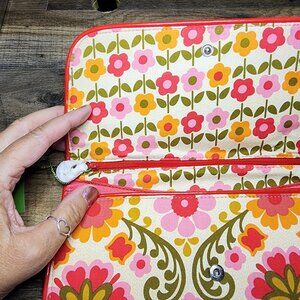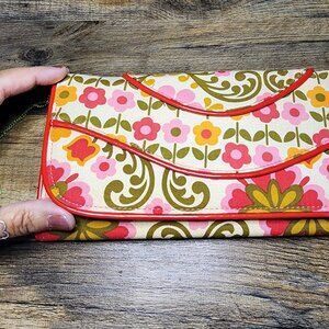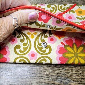 Add a pop of retro floral charm to your collection with this retired Vera Bradley Clutch Wristlet in the vibrant Folkloric pattern. This is the Making Waves style (style 11489-105), a versatile piece that works as a small clutch, wristlet, or organizer inside a larger bag.