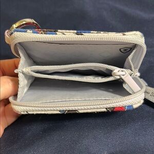 The Vera Bradley ID keychain wallet is perfect for displaying your ID without having to remove it from the wallet. There is a fabric divider so you can also carry cash/cards, and the wallet zips to secure your items. This wallet measures approximately 5” x 3”.