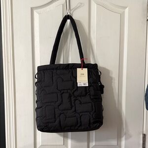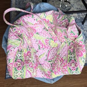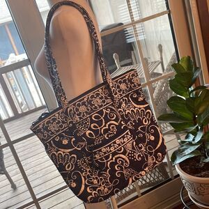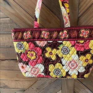 From Vera Bradley, this cute retro-inspired tote bag is green and black with white accents. Layered applique flower on the front. Leather shoulder straps. Covered magnet closure. Back zip pocket. Inner zip pocket and three slip pockets. Great water-resistant carryall.