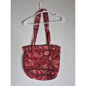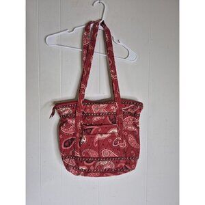 This Vera Bradley handbag in Mesa Red is a large shoulder bag made of cotton with a paisley pattern and quilted accents. It features a zip closure and measures 15 inches in width, 12 inches in height, and 12inches in length. This retired Vera Bradley product is designed in the USA and showcases a classic, colorful theme perfect for those who appreciate quality craftsmanship and unique style. (DSC)