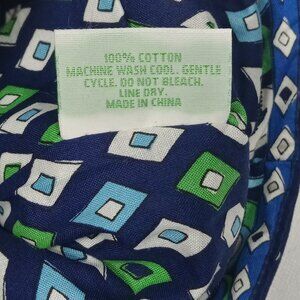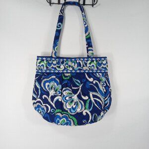 This Vera Bradley shoulder bag features a blue, white, and green floral pattern. The bag has a zipper closure, double handles, and a quilted cotton exterior and lining in shades of blue. The design includes floral accents and is a medium-sized shoulder/handbag with two front pockets, 3 interior slip packets and an interior zip pocket.