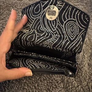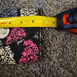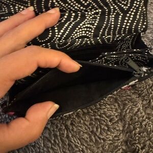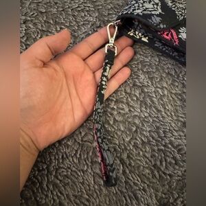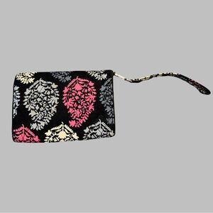 Stylish wristlet with black, pink, and cream patterns. Features a secure clasp and convenient strap.