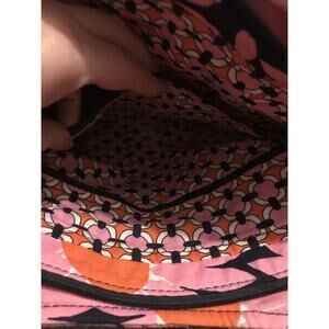 This Vera Bradley LOVES ME shoulder bag is a versatile addition to any wardrobe. With a square shape and magnetic closure, this medium-sized bag is perfect for casual occasions. The bag features a quilted finish, black shoulder strap, and silver hardware. The bag is made of cotton and has a pink, black, and orange exterior with a floral pattern. The bag has a 2 straps. The bag is a Vera Bradley Iconic product and is designed with a reversible feature. The lining is made of cotton and has a multicolor lining color.