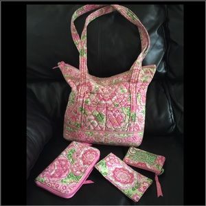 Vera Bradley set 1 shoulder bag , 1 wallet , 1check holder and 1 coin purse .