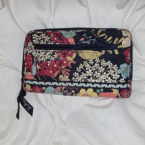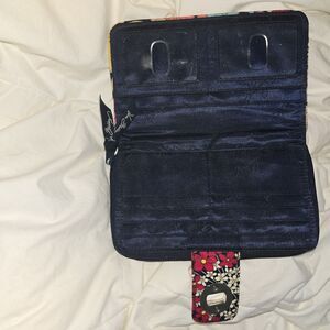 This Vera Bradley Turnlock Wallet features a cheerful Happy Snails pattern on a multicolor cotton fabric. The wallet is designed with a turn lock closure and includes a zip around compartment, credit card slots, ID slots, a zip coin area, and other practical features. The size is small (S) and the brand is Vera Bradley, known for their vibrant and stylish accessories. This clutch style wallet is perfect for women looking for a fun and functional accessory to carry their essentials.