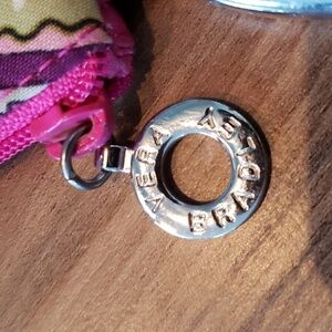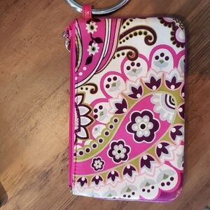 Vera Bradley Pink and Purple wristlet. Carry it on your wrist using the silver tone bracelet. Zip close and interior pockets. Big enough for your phone and all the other necessities you carry! 7" x 4.5"