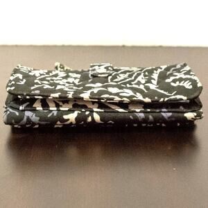 This Vera Bradley quilted cotton wristlet wallet is in the pattern Paisley Noir. This wristlet has lots of compartments. The trifold opens to 8 credit card slots, 1 ID slot, 2 slip pockets and 1 bill pocket. On the back of the wristlet there is 1 zip pocket and 1 slip pocket that snaps shut. This wallet has silver hardware and a removable wrist strap. 4" (H) X 7" (W) with a 7" wrist strap