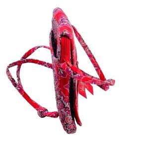 This small Vera Bradley handbag sports a vibrant red paisley design, complete with a button zipper closure. Its crossbody style and multi-compartments make it as functional as it is fashionable. The flap cover and logo zipper pull add a chic touch.