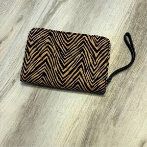 Excellent like new condition. Zip around feature. Inside has cc slots, zipped inner pouch. Black and tan zebra pattern. Measures 7 1/4” Wide by 5” Tall.