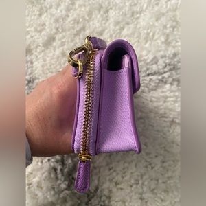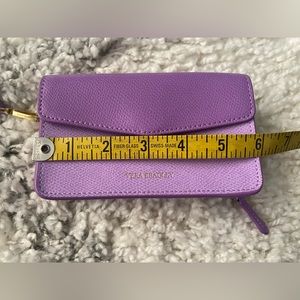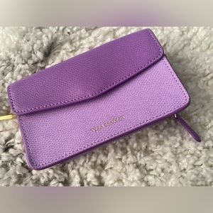 Vera Bradley purple lilac genuine leather wristlet wallet with gold hardware. This fits iPhones perfectly. The inside of the wallet has several places for ID and card storage. Metal snap front. NWT.