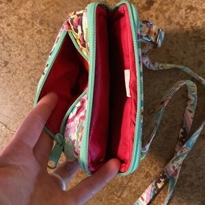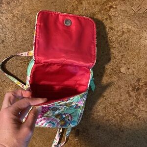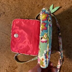 Vera Bradley credit card wallet mini crossbody purse in green and pink paisley Tutti frutti print. Approximately 6”x 8” x 1”. See pictures for details.