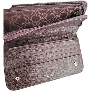 The VERA Pelle Ivory Pebbled Leather Clutch Wallet is a stylish and elegant accessory for women. Made in Italy, this wallet features a snap close design and is crafted from high-quality leather. The pebbled texture adds a unique touch to the ivory color, making it a versatile and chic addition to any outfit. This sleek wallet is perfect for storing essentials while on the go, credit cards, zippered coin purse and detachable wrist strap.