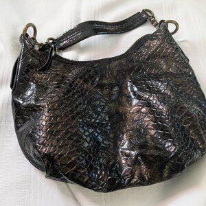 Vera Wang - Simply Vera . Modern shoulder bag in grey crocodile embossed pattern by Simply Vera with brass/pewter hardware. It has a top magnetic snap closure. The interior features a zippered side pocket and two slip pockets. Great condition.