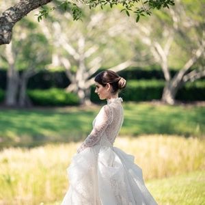 Light ivory long sleeve ballgown with hand applique macrame lace panels on the bodice, sleeves and skirt