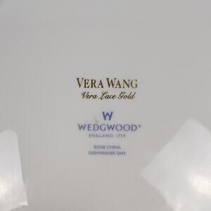 The VERA WANG for (W) Wedgwood Vera Lace Gold Salad Plate is a luxurious and elegant addition to any table setting. Made of fine bone china with a glossy finish, this round 8" plate features a traditional floral lace pattern in white and gold. Perfect for all occasions, this original Vera Wang design exudes sophistication and style. With its dishwasher-safe construction and pottery production technique, this salad plate is both practical and timeless, making it a beautiful choice for adult dining rooms in the late 20th century. Made in the United Kingdom, this plate is a true symbol of craftsmanship and refinement. It does have some fading. See pic.