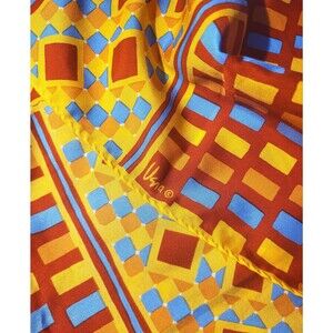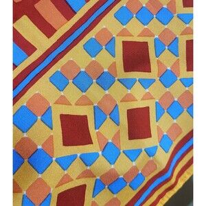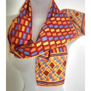 Stunning oblong Vera scarf with Mod geometric print in pale orange,(yellow in some pics) an autumn orange, and red with pops of bird egg blue. Perfect touch of color for neck, hair, purse, and more. Incredibly versatile. A couple snags and smudge see pics, otherwise in excellent condition. Keep in mind color may vary depending on different viewing screens. Appx 47x11