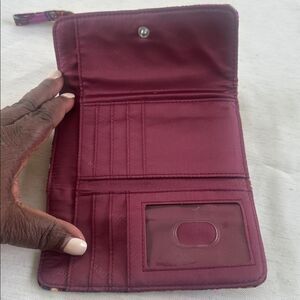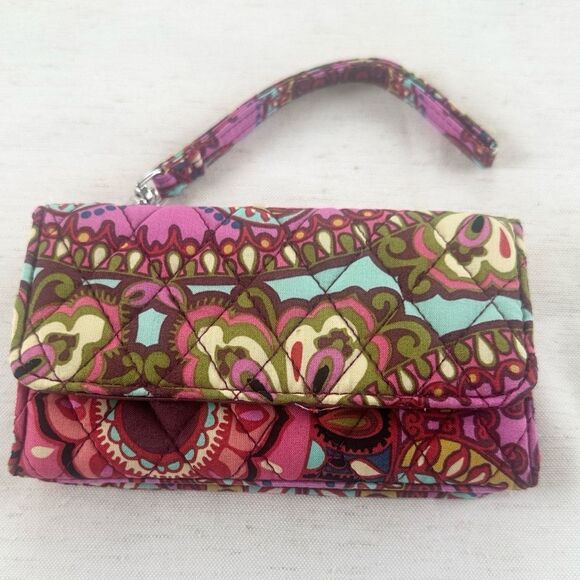 It features an exterior slip pocket, 7 card slip pockets, an ID window, 2 slip pockets and a bill pocket. There is both a zip and a pin-snap closure. How fantastic to be able to carry both your wallet and your phone in an all-in-one beautiful wristlet!