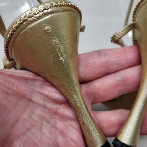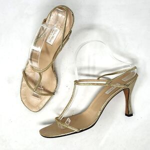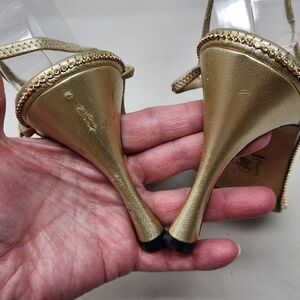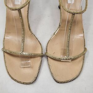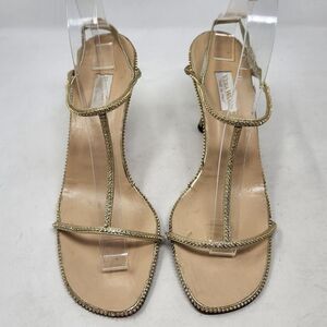 Gold colored strappy minimalist sandals covered in tiny clear rhinestones. They are a women's size 9. The heels measure just over 3.25" and have scuffing on them as shown in the photos. Please examine all the photos as this is the exact pair you will receive. Thank you so much for looking. I am always open to reasonable offers. Have a fantastic day.