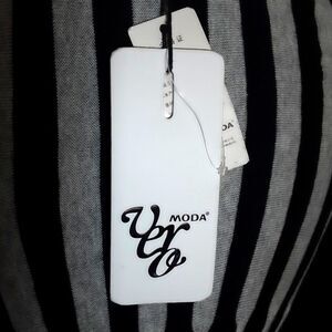 A very unique dreas, this is one to show off curves! Lightly form-fitting bwcause it's a atretch knit, it will fit any of a number of shapes and measurements.nThe brouad black and white stripes are very flattering and the contrasting belt adds a touch of retro coquettishness!